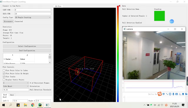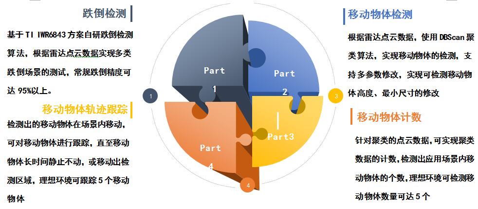 当在检测范围内出现人体(通常为老年人)的非常规行为,例如躺倒在地板上一定时间内(客户可自行设置时间),设备就会发出报警,通知监护人进行查看救援。